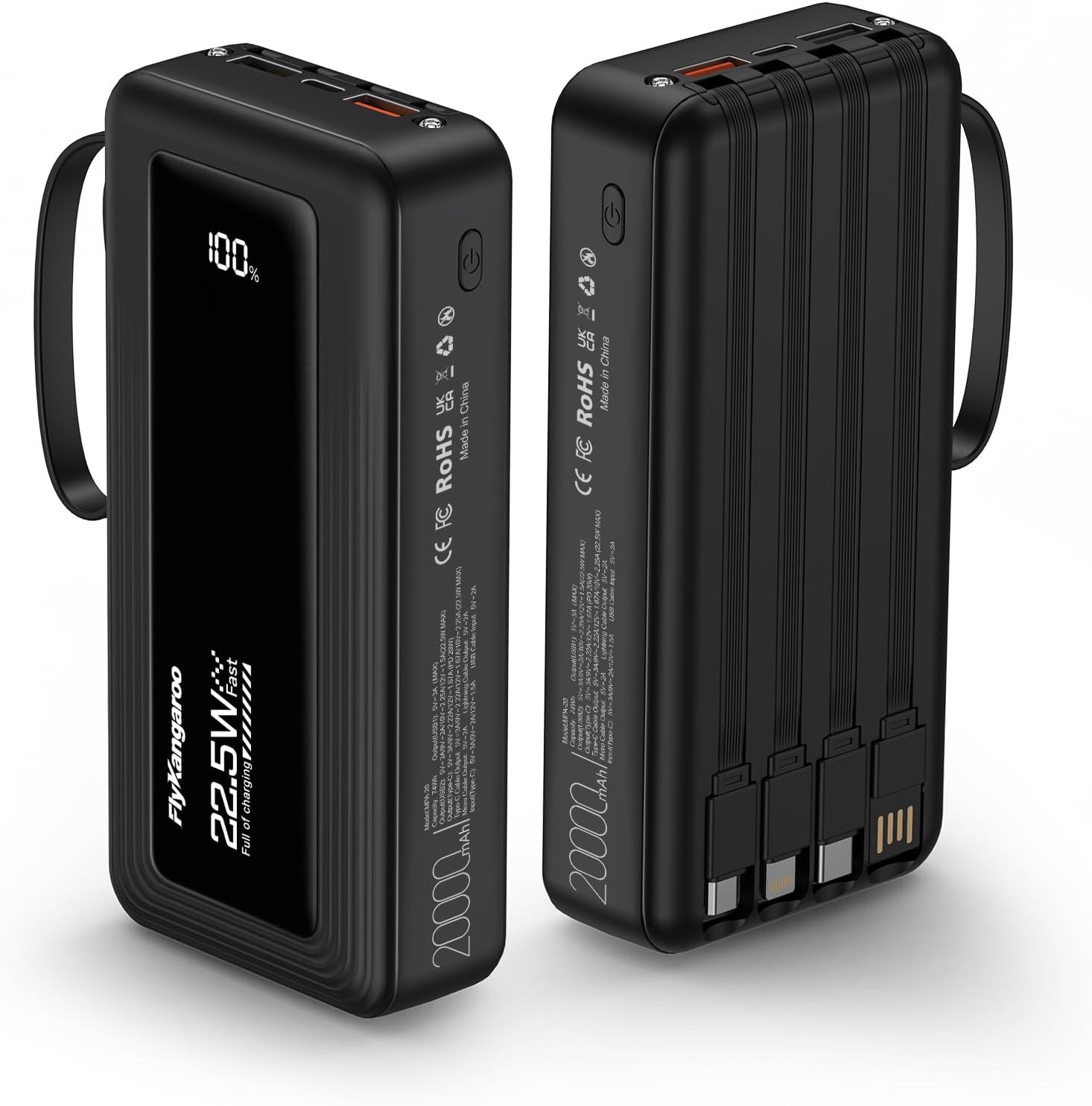 Portable Charger with Built-in Cables, 20000mAh Slim 22.5W Fast Charging Power Bank with LED Display, USB C Battery Pack 6 Outputs & 2 Inputs, Travel Essential Charger for iPhone, Samsung, Google etc