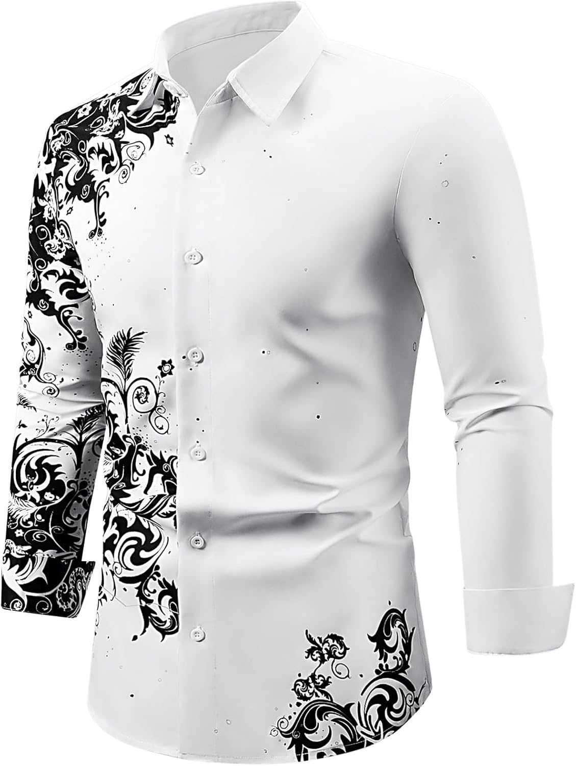 Men's Floral Button Down Shirts Color Block Long Sleeve Business Dress Shirt