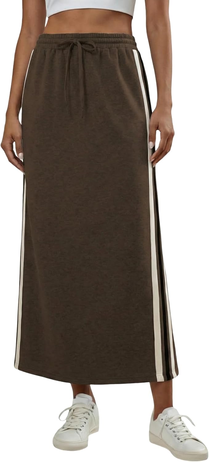 EsheSy Womens Cotton Maxi Sweat Skirt Elasitc High Waist Drawstring Side Striped Daily Practice Casual Long Skirts
