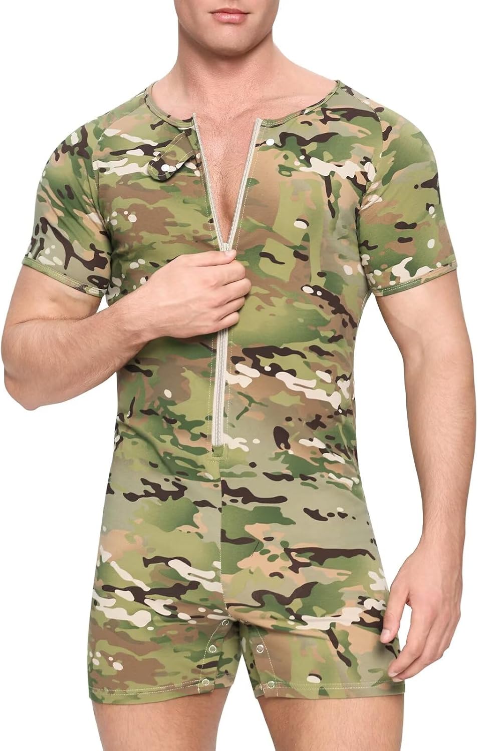 Landofgenie Onesie for Men Cotton Short Sleeve Camouflage Pajama Jumpsuits One Piece Printed Romper Bodysuit Zipper Up