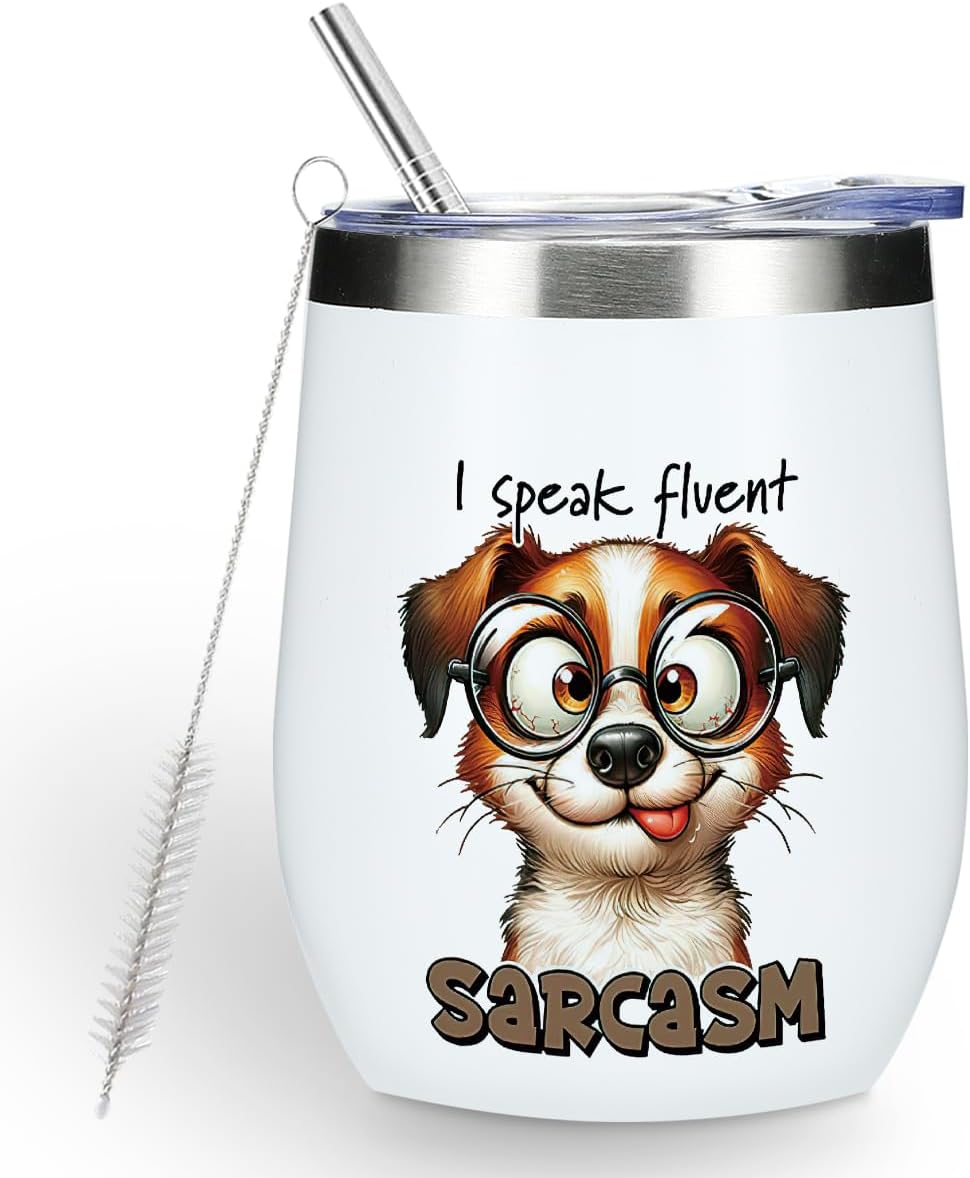 Funny Quotes Wine Tumbler, Sarcastic Cartoon Dog Gifts Dog Decor Stuff Double Wall Vacuum Insulated Coffee Mug Wine Glass 12 oz Tumbler with Lid for Sister Best Friend Brother Birthday Christmas