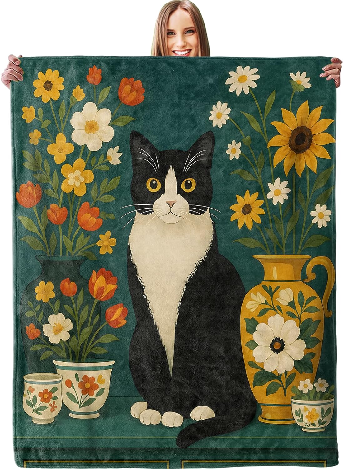 Cute Cat and Floral Blanket, Soft Lightweight Warm Cozy Flannel 60×50 inch Throw Blanket for Couch, Travel, Bed, Outdoor, Gifts for Women Men Adults Kids