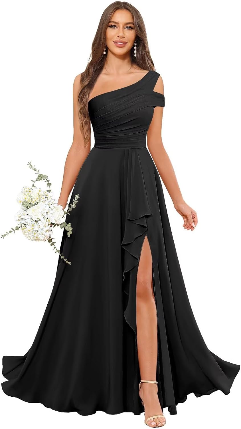 One Shoulder Bridesmaid Dresses Long for Wedding with Slit Ruffles Pleated Chiffon Formal Evening Gowns