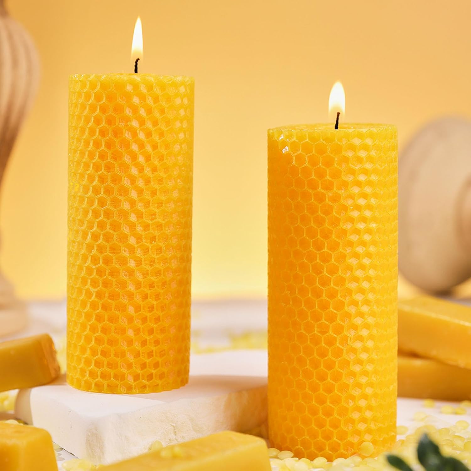 - Pure & Natural Beeswax - A Gift from Nature: Crafted from 100% pure, all-natural beeswax, these hand-rolled pillar candles offer an authentic and wholesome glow. Unlike paraffin alternatives, our beeswax is sustainably sourced, ensuring a non-toxic and eco-friendly burn. The distinctive honeycomb texture is a testament to their artisanal creation, bringing a touch of natural elegance and rustic charm to any setting. Experience the subtle, sweet aroma of honey and the gentle, warm light that only pure beeswax can provide.