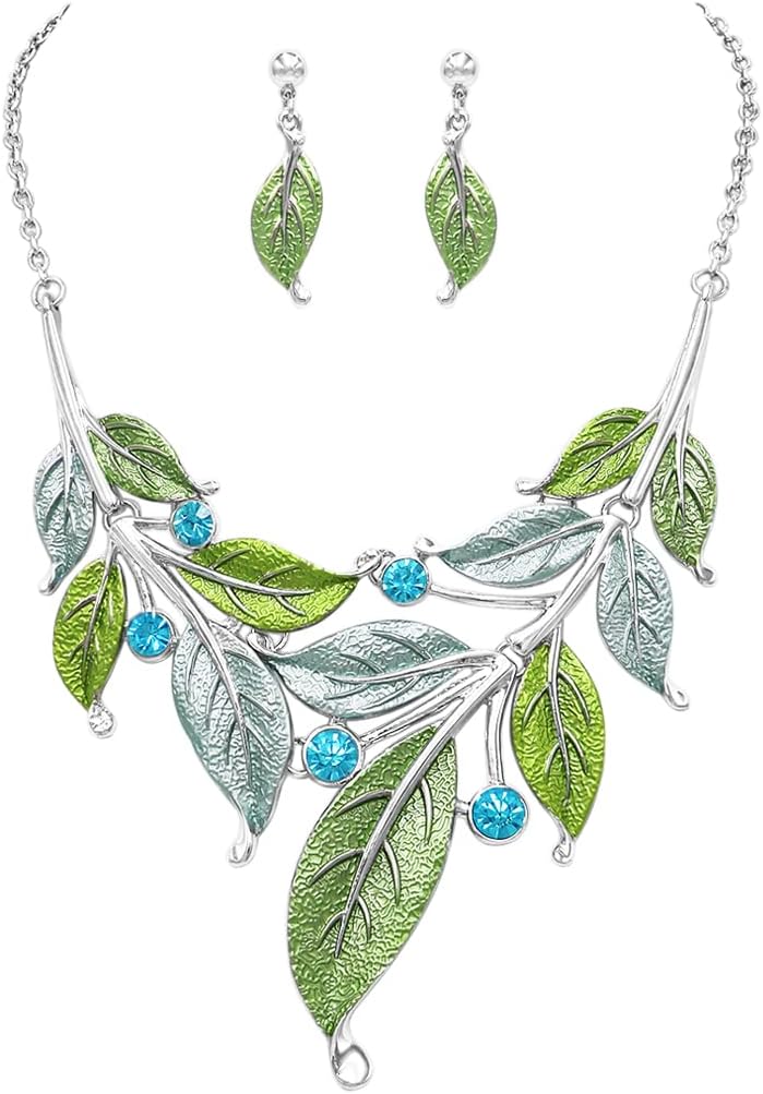 Rosemarie Collections Women's UnbeLeafable Vine And Leaves Crystal Rhinestone Statement Necklace Earrings Set, 14"+3" Extender