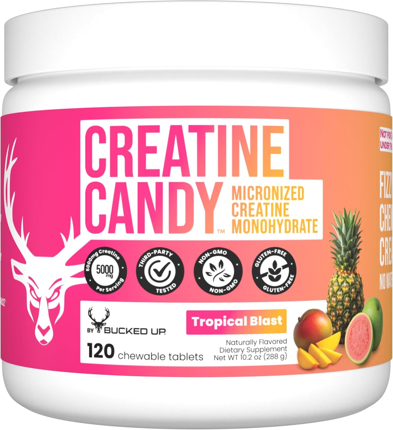 Bucked Up Creatine Candy Tropical Blast | Micronized Creatine Monohydrate | 120 Chewable Tablets, 24 Servings | Fizzy Creatine No Water Needed | Non GMO Gluten Free Third Party Tested
