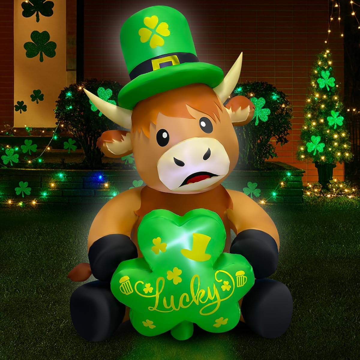 - Vibrant and Eye-Catching Design – Perfect for St. Patrick’s Day Decorations! Standing at a delightful 5 feet tall, this charming inflatable Highland cow, adorned with a lucky shamrock hat, adds a playful touch to your yard, garden, or entryway, setting the mood for an unforgettable St. Patrick's Day celebration.