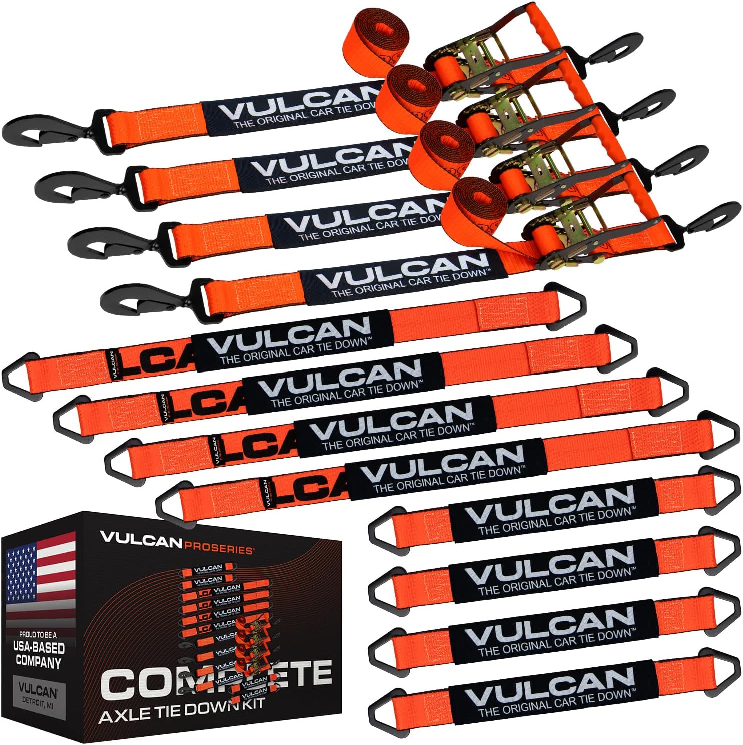 - Professional grade tie downs - Professional truck, auto hauler, flatbed, and trailer operators choose Vulcan auto tie down systems to haul millions of cars every year. Vulcan is recognized as the most qualified car tie down manufacturer in the world. This complete kit of axle straps and ratchet straps avoids scratching delicate rims or damaging the underbody of the vehicle. These straps are backed by 50 years of manufacturing expertise that only Vulcan can provide.