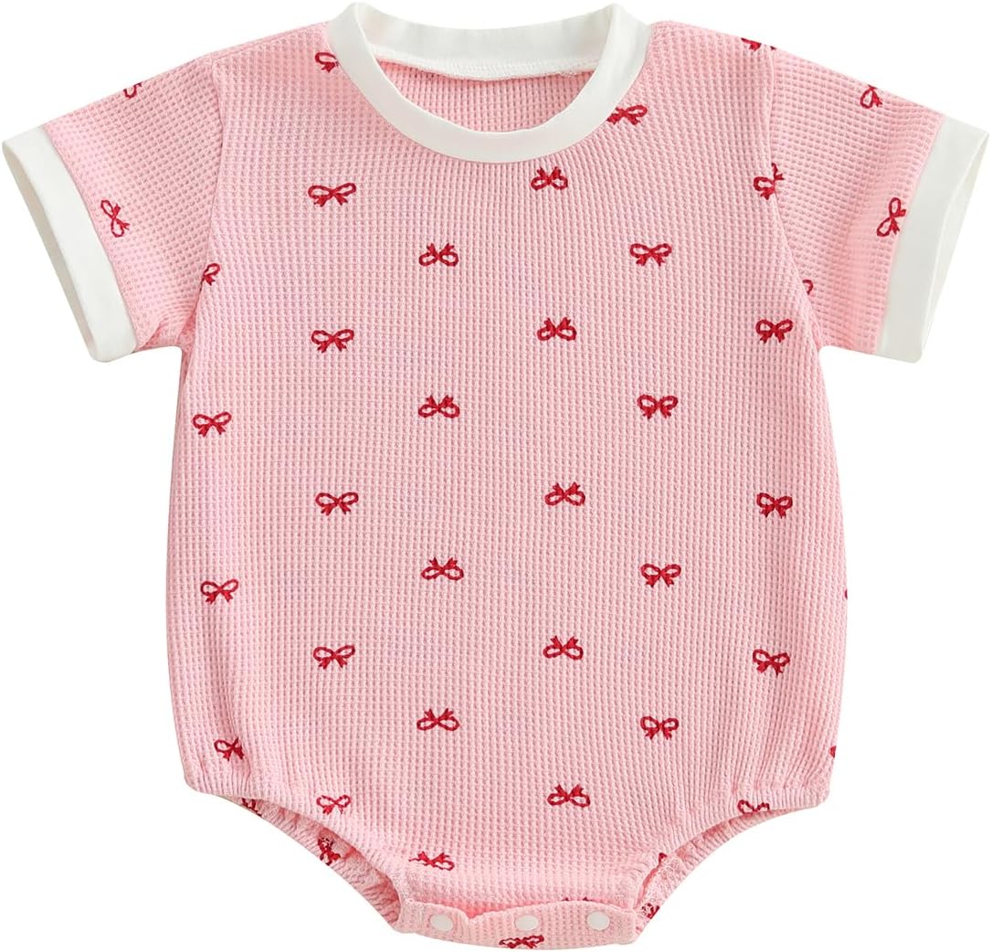 Adobabirl Baby Girl Outfit Newborn Bow Bubble Romper Short Sleeve Waffle Jumpsuit Shirt Infant Cute Summer Clothes