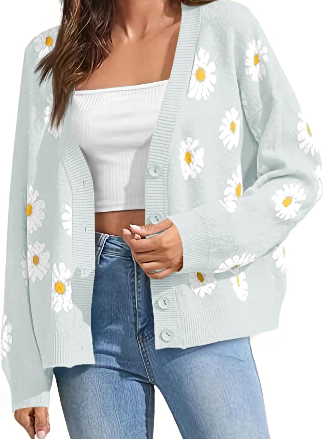 Women's Floral Print Cardigan Long Sleeve Open Front Button Down V Neck Knitted Sweaters
