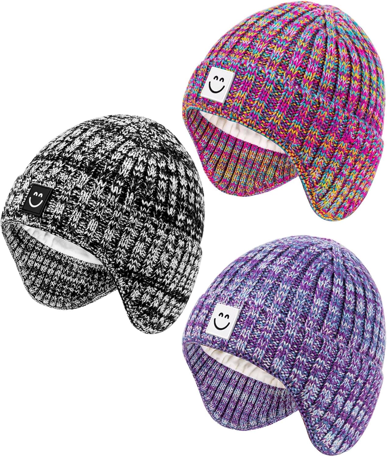 Alepo 3 Pack Baby Beanie Hats with Earflaps, 2 Size Baby Winter Hat for Toddler Kids, Fleece Lined Knit Hat for Girls Boys