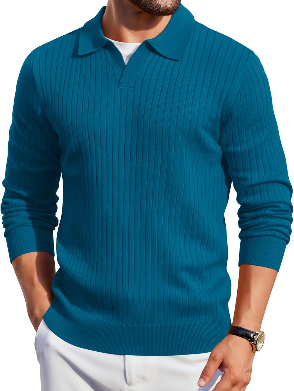 COOFANDY Men's Long Sleeve Polo Sweater Knit Casual V-Neck Collared Golf Polos - Blue