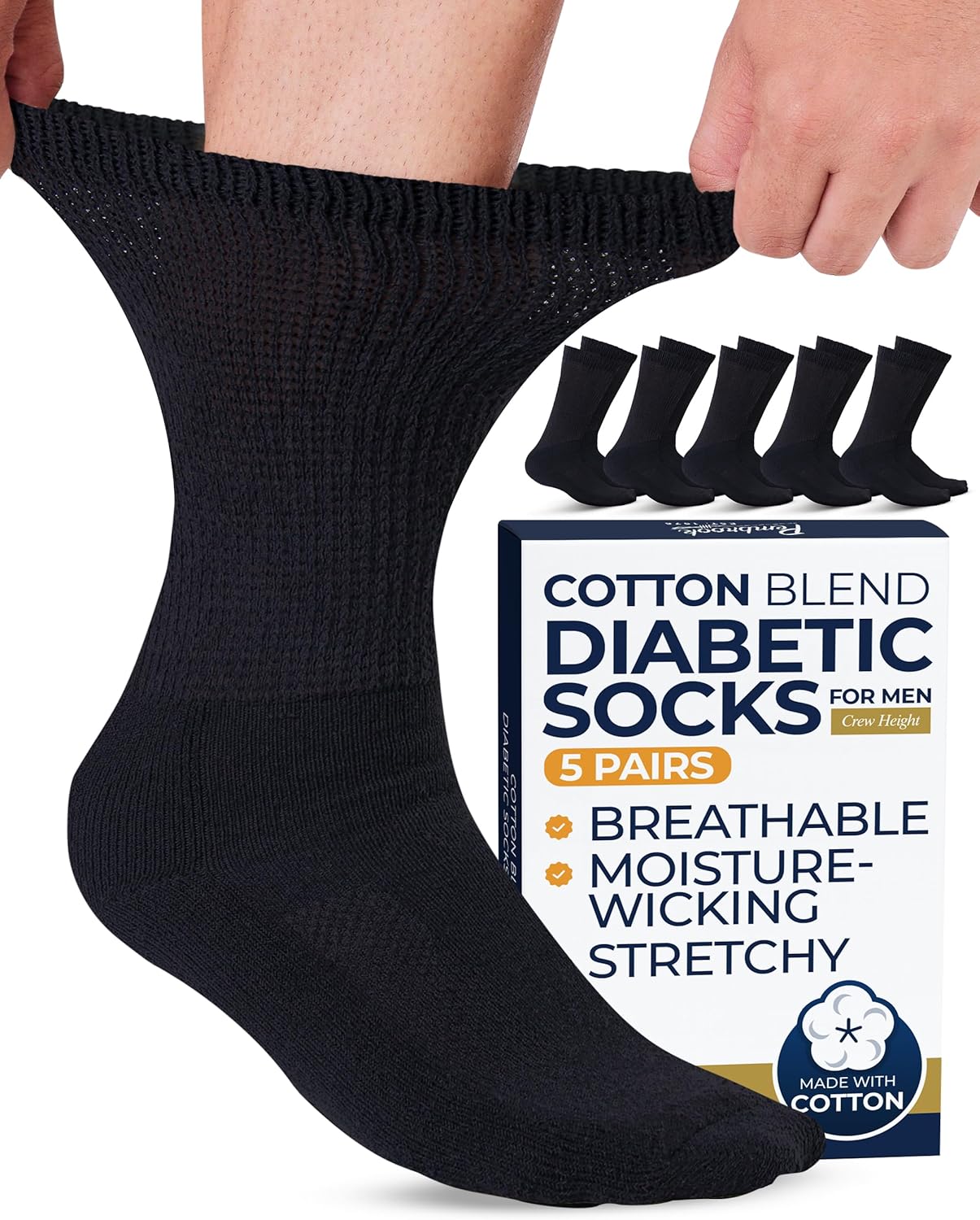 Pembrook Cotton Diabetic Socks for Men - 5 Pairs Crew Mens Diabetic Socks, Non-Binding, Moisture-Wicking, Loose Fit