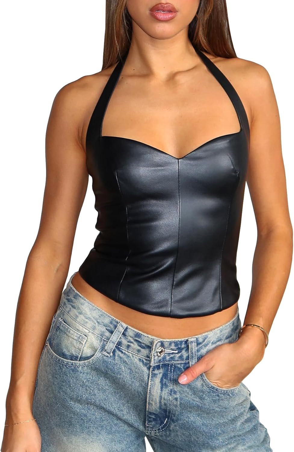 Women Sexy Leather Top Sweetheart Neckline Halter Tops Backless Club Party Rave Going Out Tops