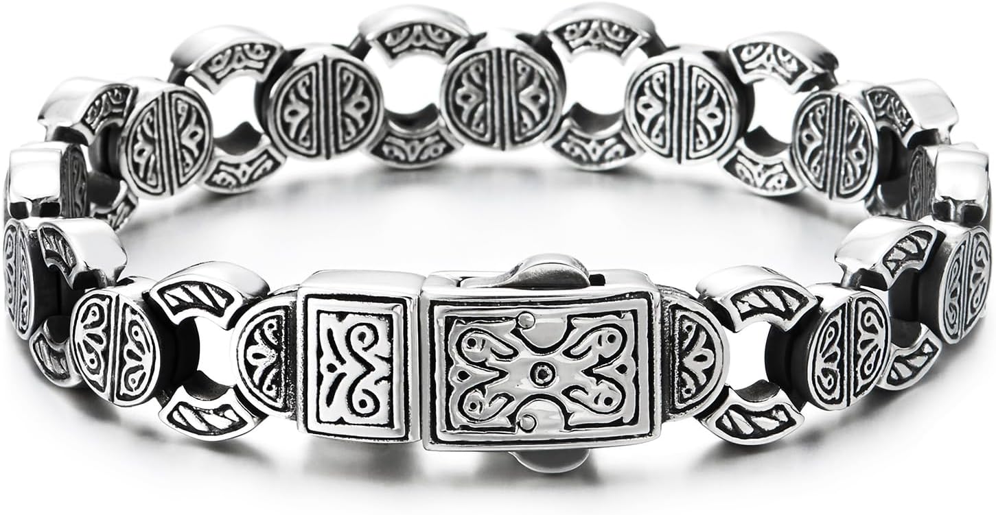 COOLSTEELANDBEYOND Mens Tribal Tattoo Pattern Circle Link Chain Bracelet, Fancy Vintage Stainless Steel, Spring Clasp