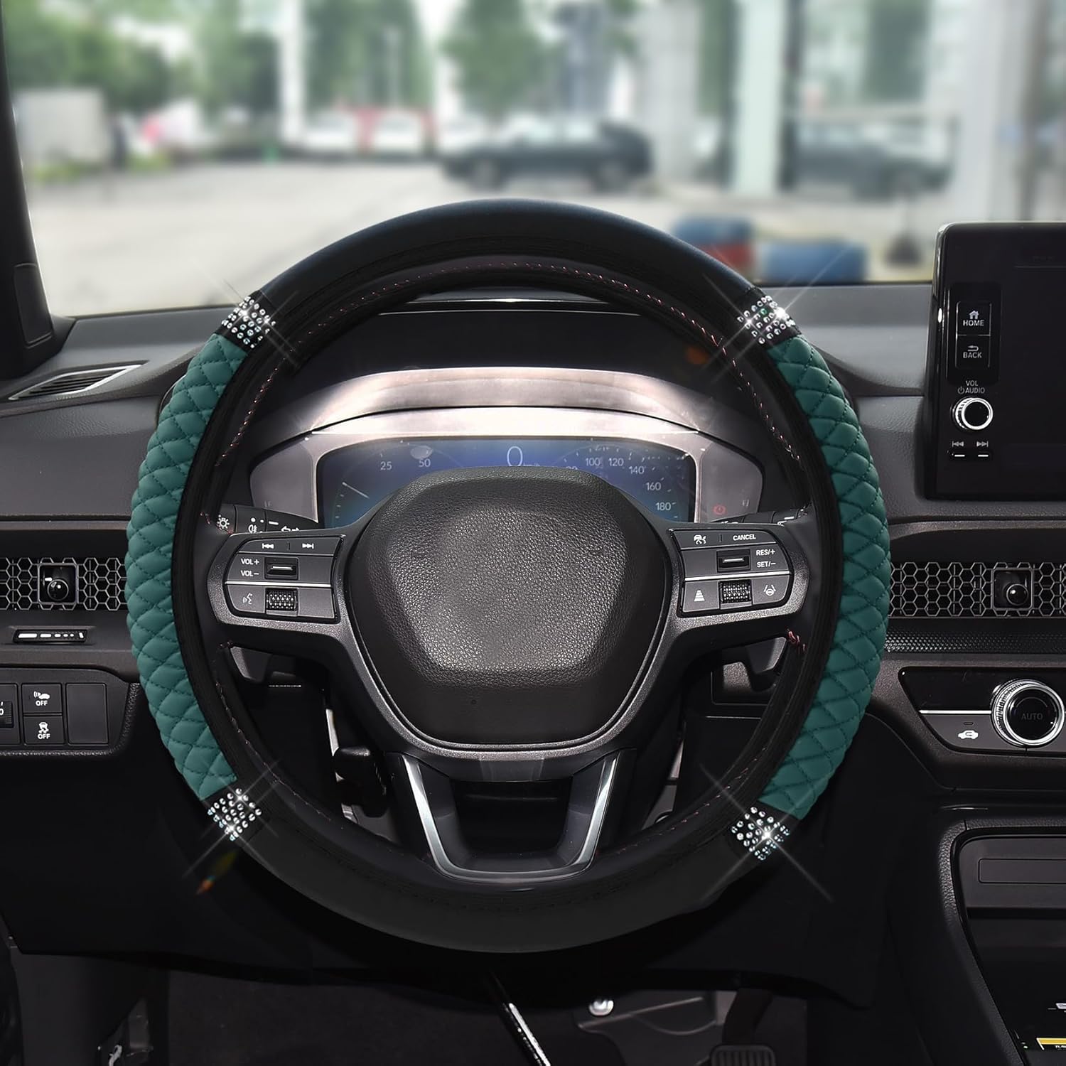 Bling Soft Leather Steering Wheel Cover, 15 Inch Colorful Rhinestones Auto Elastic Steering Wheel Protector for Women Girls, Car Accessories Anti Slip Steering Wheel Cover for Cars, SUVs (Dark Green)