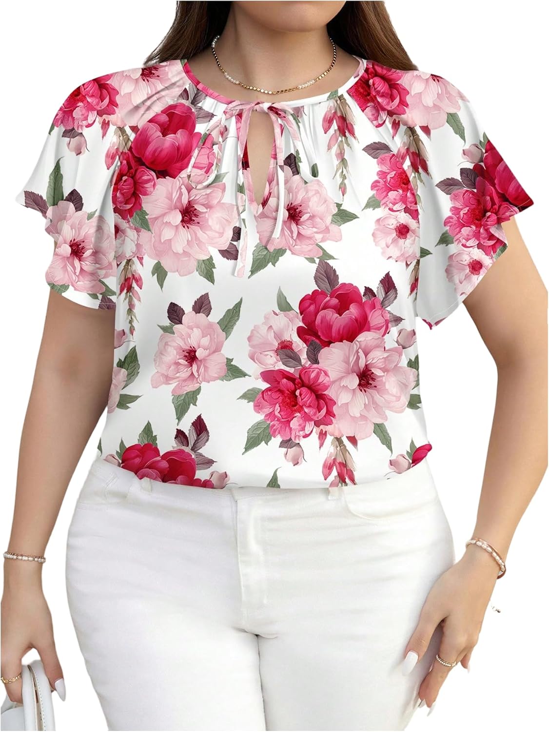 Floerns Women's Plus Size Floral Tie Neck Blouse Ruffle Short Sleeve Elegant Shirt Tops