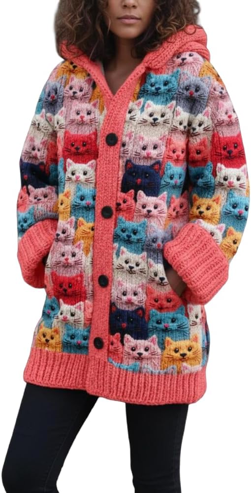 Women's Ethnic Floral Hooded Cardigan Long Sleeve Button Cardigans Midi Knit Jacket Fall Winter Warm Cat Print Sweater