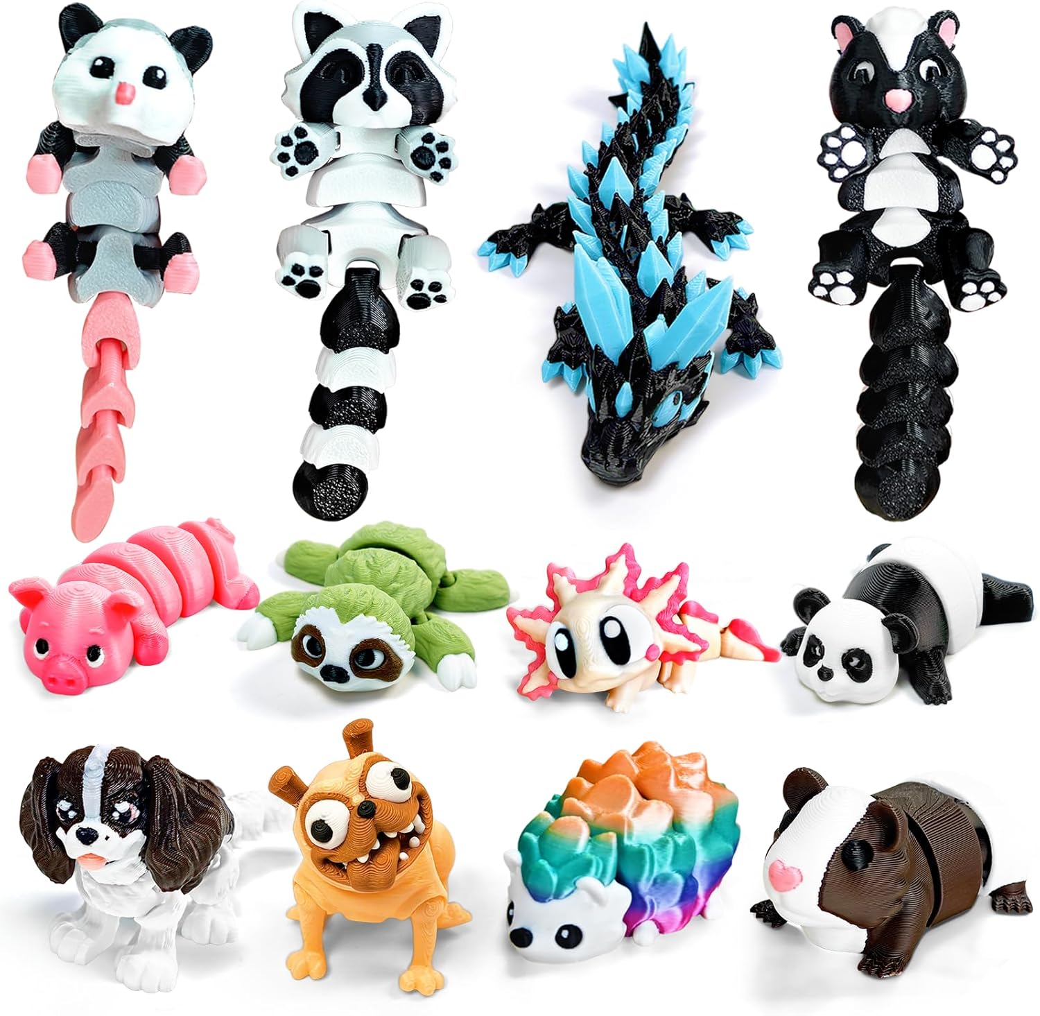 12 Pcs 3D Printed Animal Figurines Set, Articulated Flexible Desk Pets, 4 Inch Mini Animals for Home Office Decor (Dog, Panda, Dragon,Sloth, Raccoon)