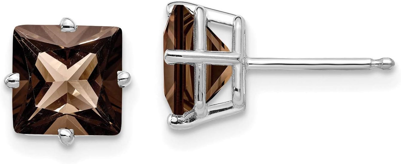 14k White Gold Stud Earrings with Square Smoky Quartz, Four Prong Setting, Real Gold Modern Studs, Brown Gemstone Earrings for Women, Elegant Minimalist Design for Daily Wear or Formal Looks 8x8 mm