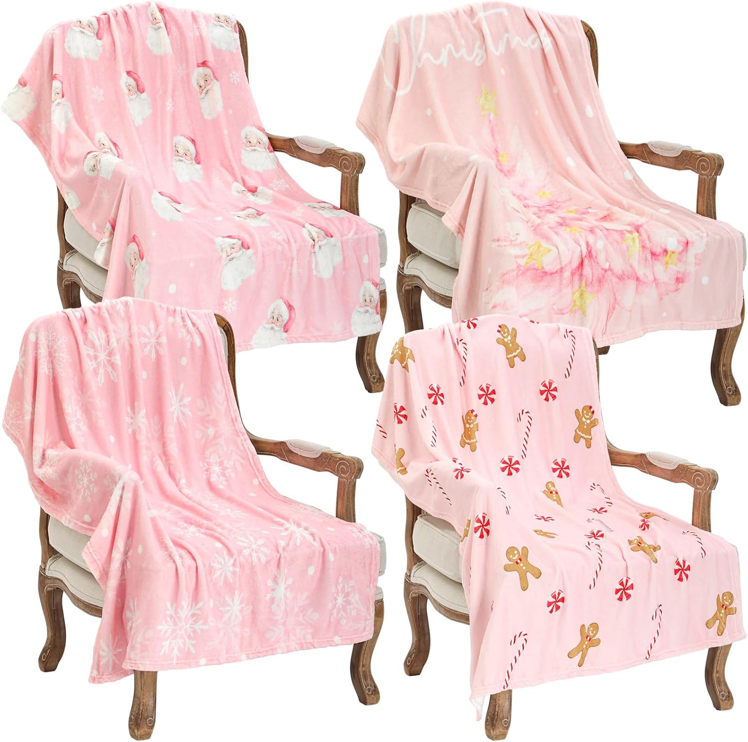 - Package Contents: Includes 4 adorable pink Christmas blankets in coordinated designs: pink Santa, pink Christmas tree, white snowflakes on pink background, and gingerbread man on pink background. Ideal for those who love a softer, more whimsical holiday aesthetic. Perfect for gifting or cozying up in festive flair