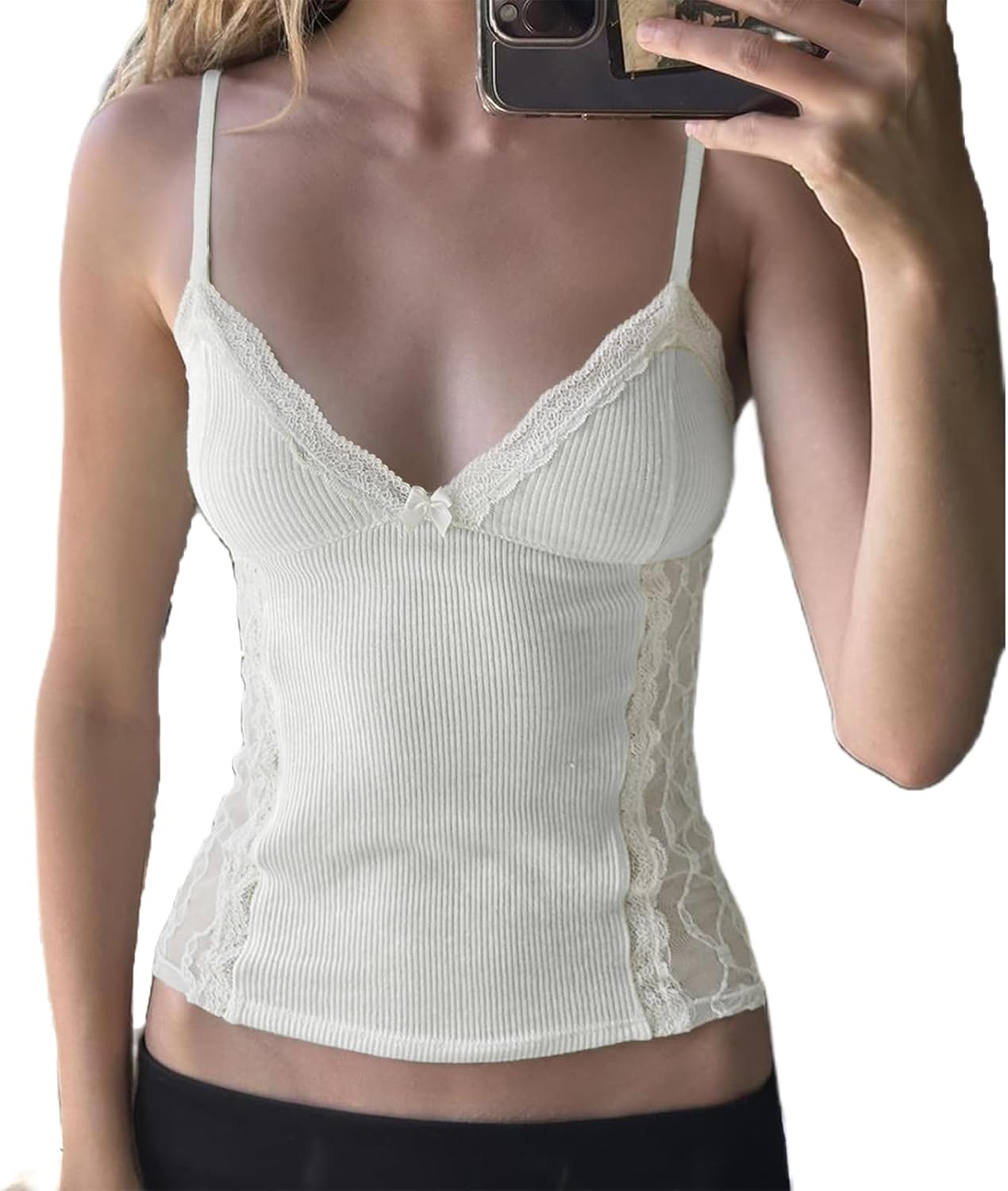 Women Y2K Cami Top Going Out Spaghetti Strap V Neck Lace Patchwork Ribbed Skinny Crop Tank Top Vintage 90s Coquette Aesthetic