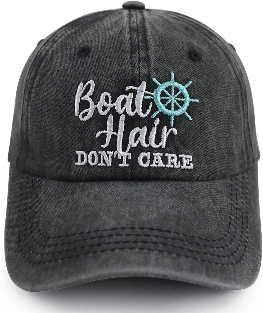 Boat Hair Don't Care Hats for Men Women, Adjustable Embroidered Cotton Washed Distressed Denim Fishing Baseball Cap