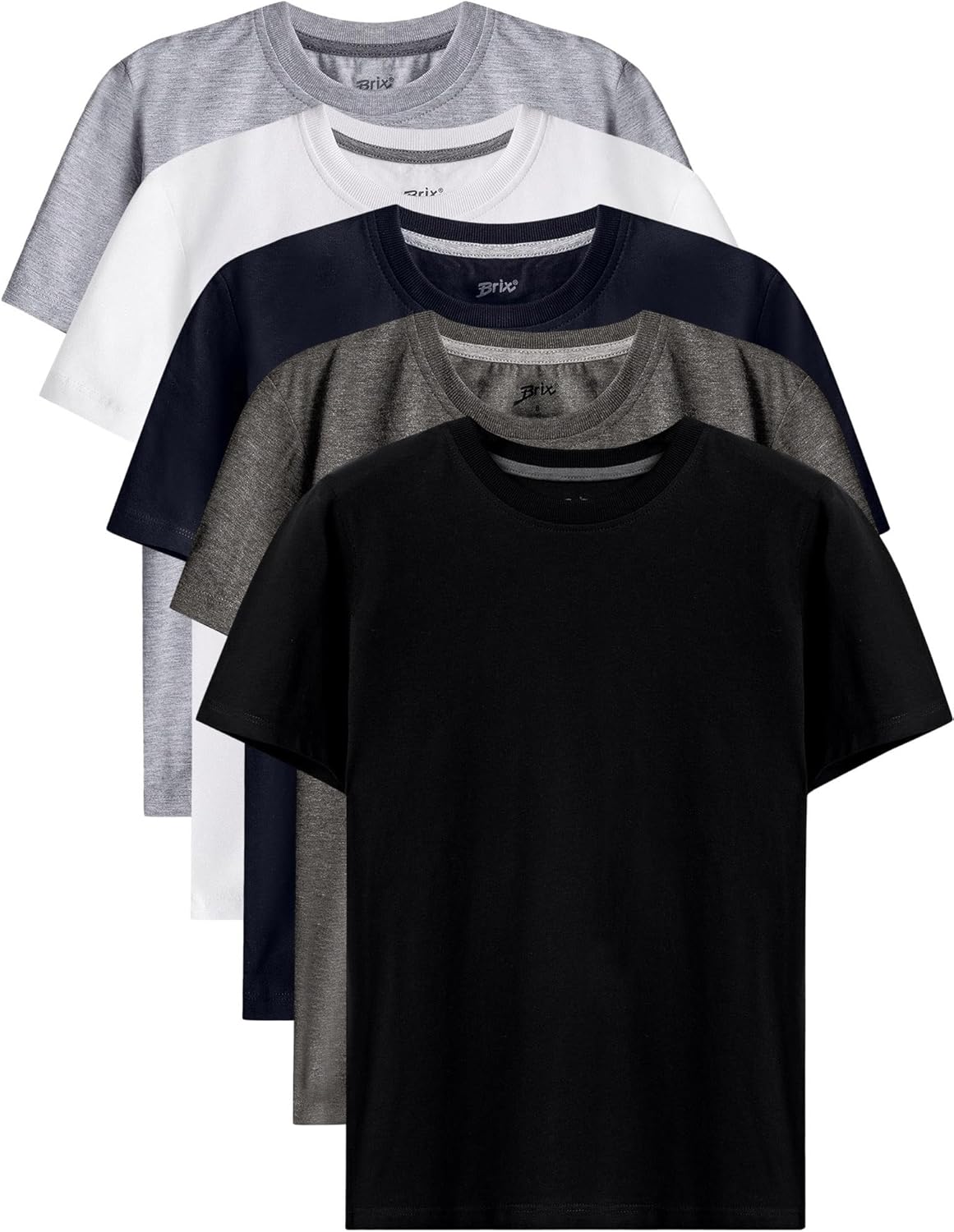 Brix Boys 5 Pack T-Shirts - Crewneck 100% Cotton Tagless Multipack Kids Short Sleeve Basic Comfort Tees.