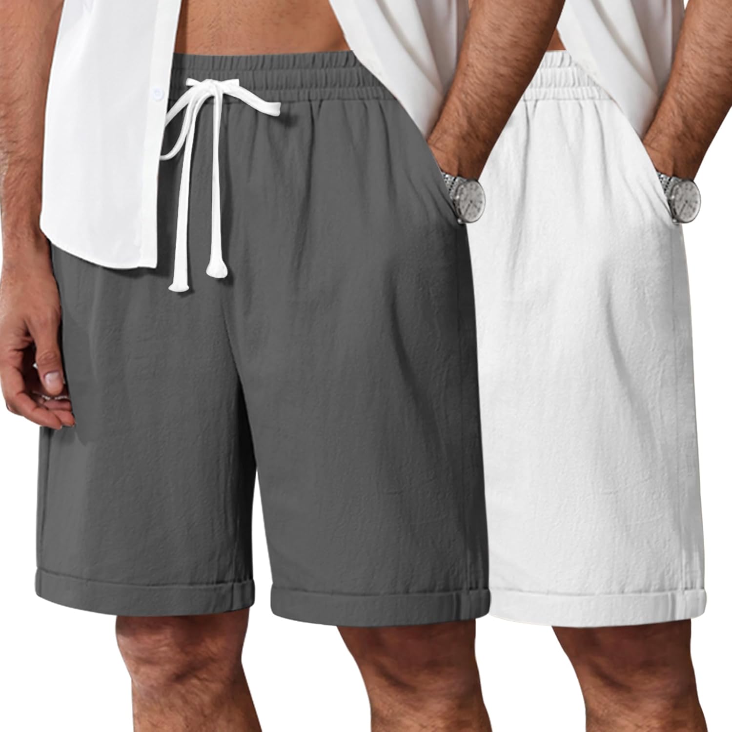 Ficerd 2 Pack Men's Linen Shorts Casual Elastic Waist Drawstring Stretch Summer Beach Vacation Wear with Pockets