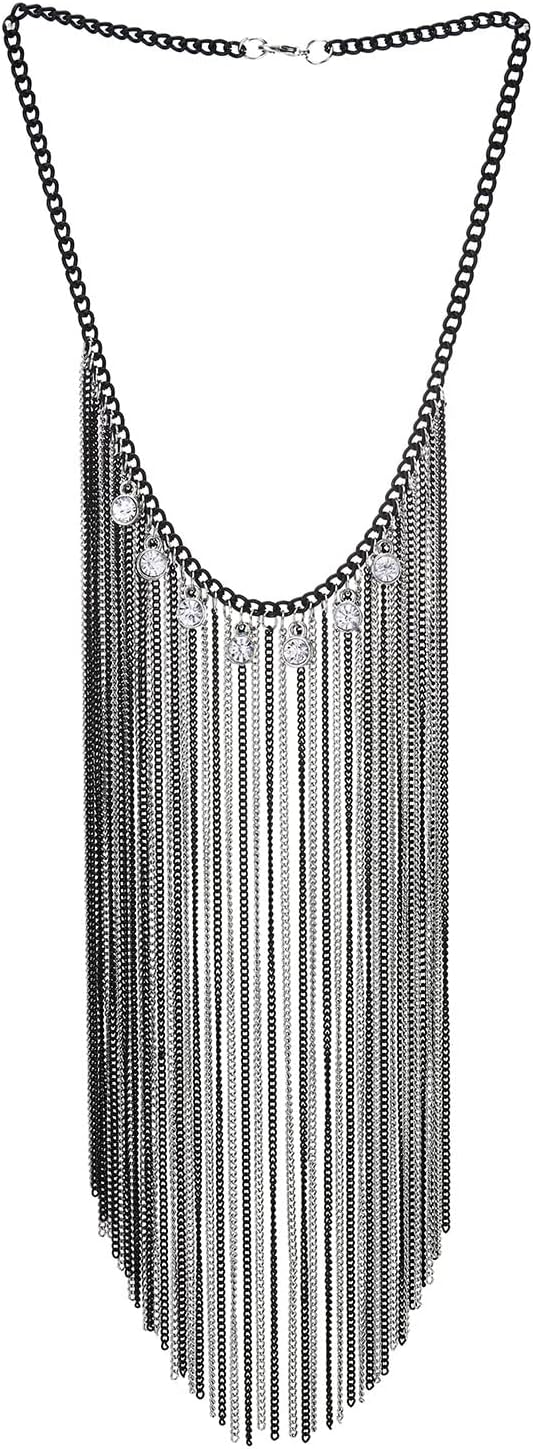 COOLSTEELANDBEYOND Bohemian Silver Black Collar Necklace Multi-Layer Cubic Zirconia Chains Waterfall Tassel Pendant Bib