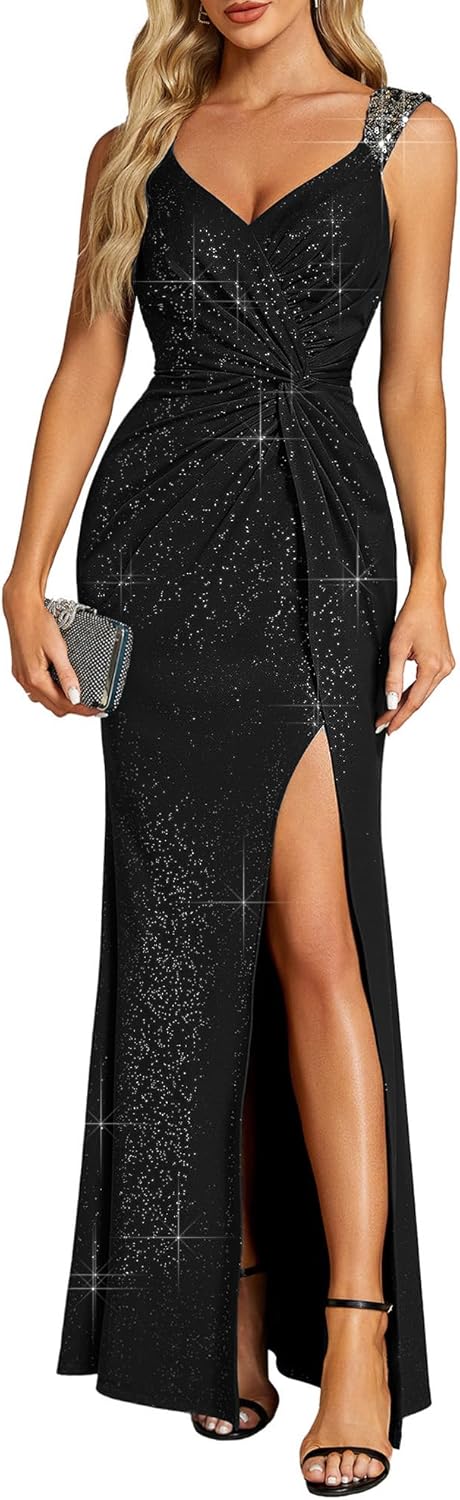 Ever-Pretty Women's Formal Wedding Guest Dresses V-Neck Stretchy Glitter Bodycon Sleeveless High Split Sexy Prom Dress
