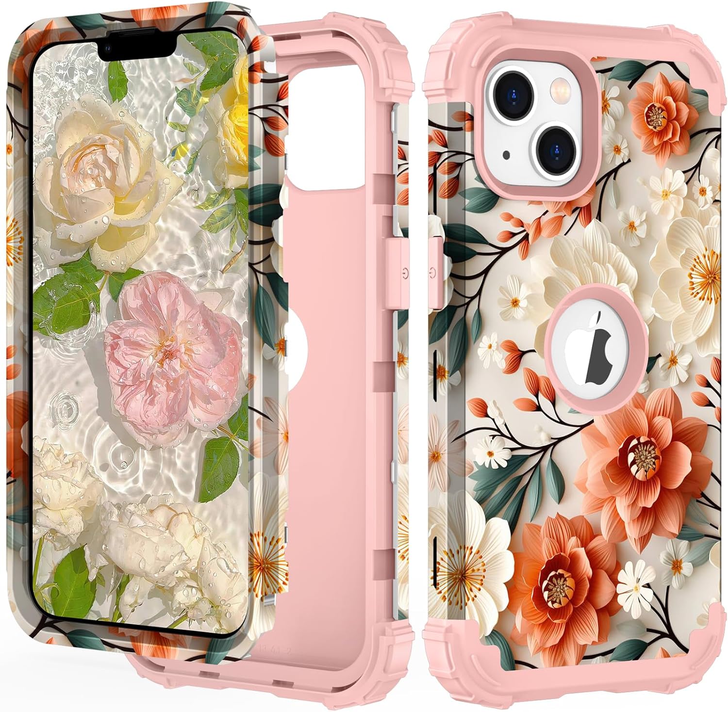 PIXIU Unique Flower Pattern Compatible with iPhone 13/14 6.1 inch case, Heavy Duty Dual Layer Shockproof Full-Body Protective Sturdy Hybrid Cute Rugged Case for Women,Girls,Kids-White/Orange