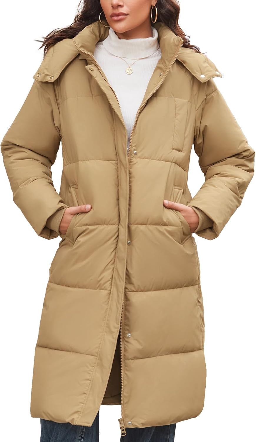 Flygo Long Winter Coats for Women Hooded Puffer Coat Jackets Thickened Midi Long Sleeve Zip Down Parka Outerwear