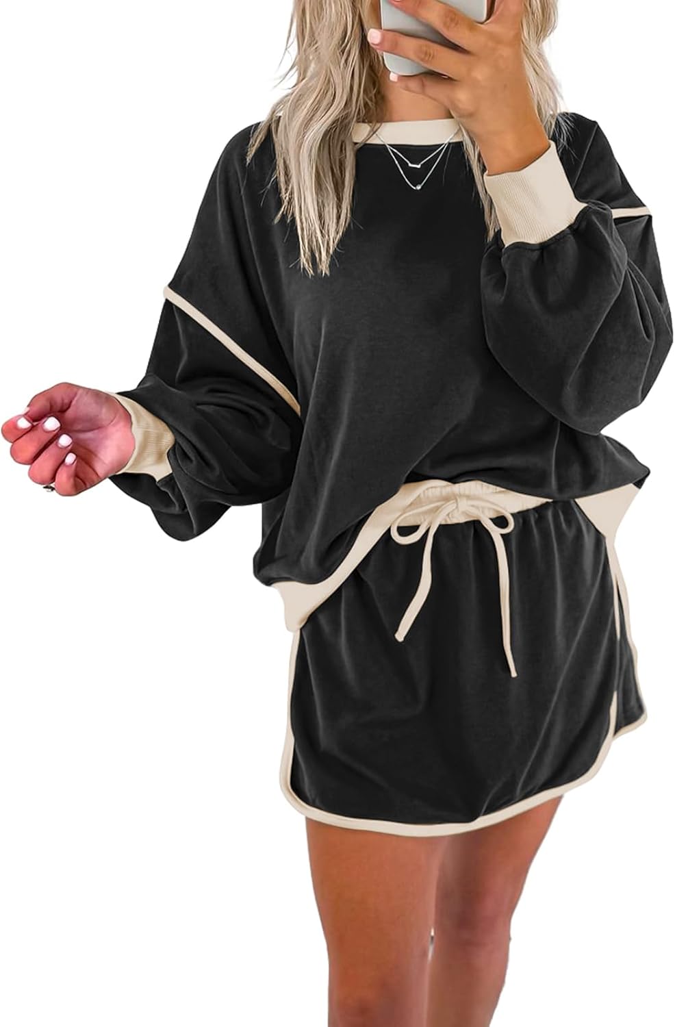 miduo Womens Color Block Casual Long Sleeve Sweatshirt and Drawstring Mini Skirt Matching Sets 2 Piece Skirt Set
