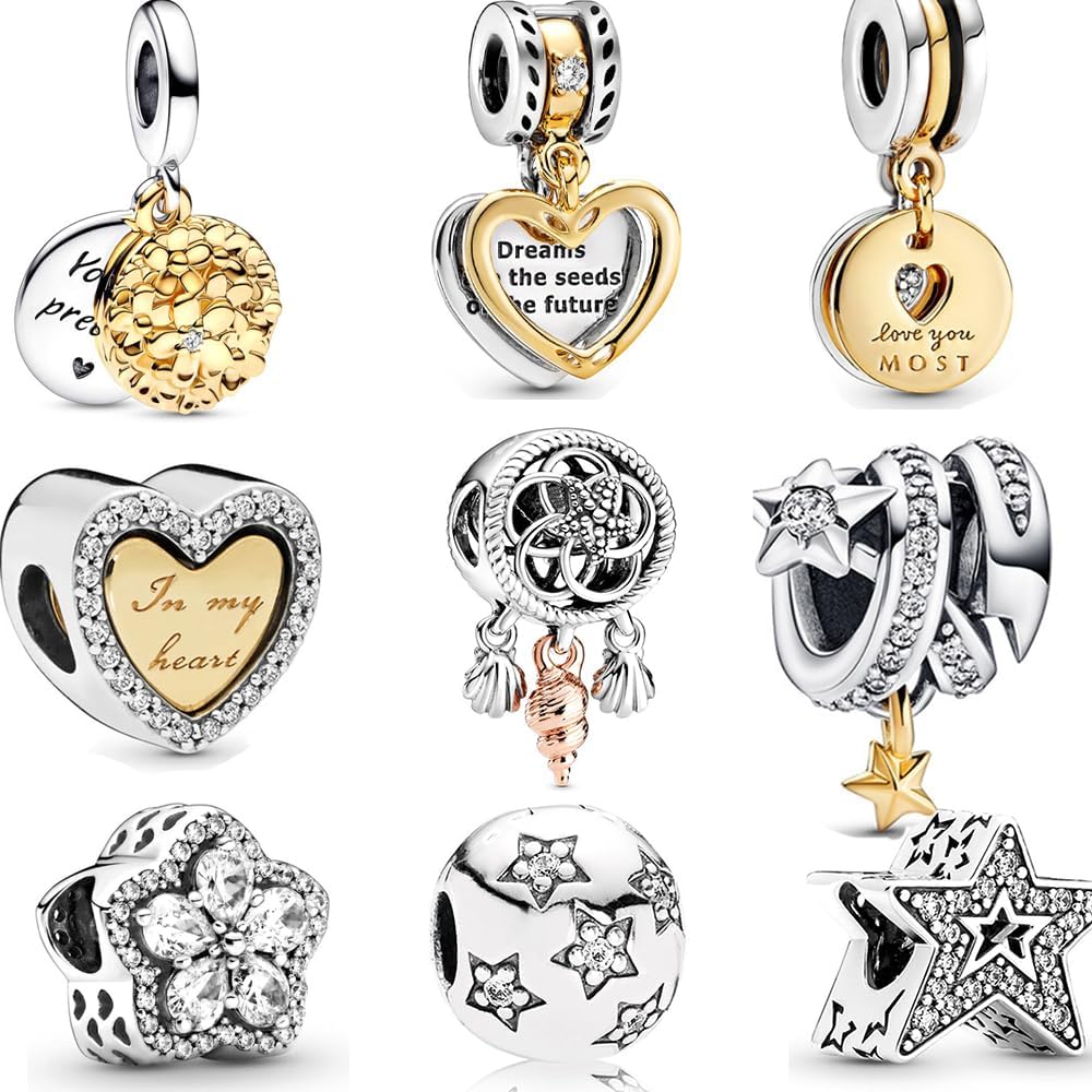9 Pack Silver Bead Charms for Bracelets and Necklaces Charm for Woman Cubic Zirconias Dangle Pendant Jewelry Beads Set