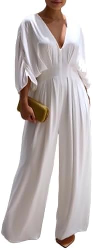 CHICME Women's V-Neck Half Sleeve Ruched Jumpsuit Casual Flowy Wide Leg Pants One Piece Jumpsuit