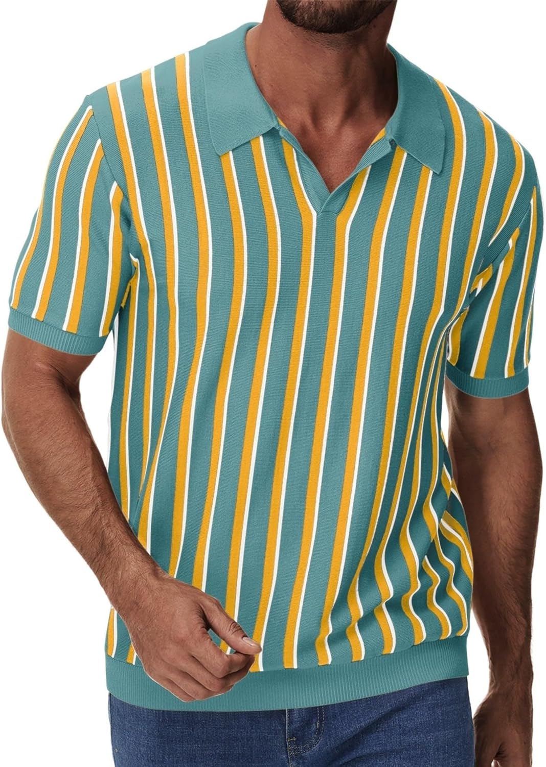 iWoo Men's Knit Polo Shirts Short Sleeve Casual Vintage Striped Golf Polo Classic Collared T Shirt