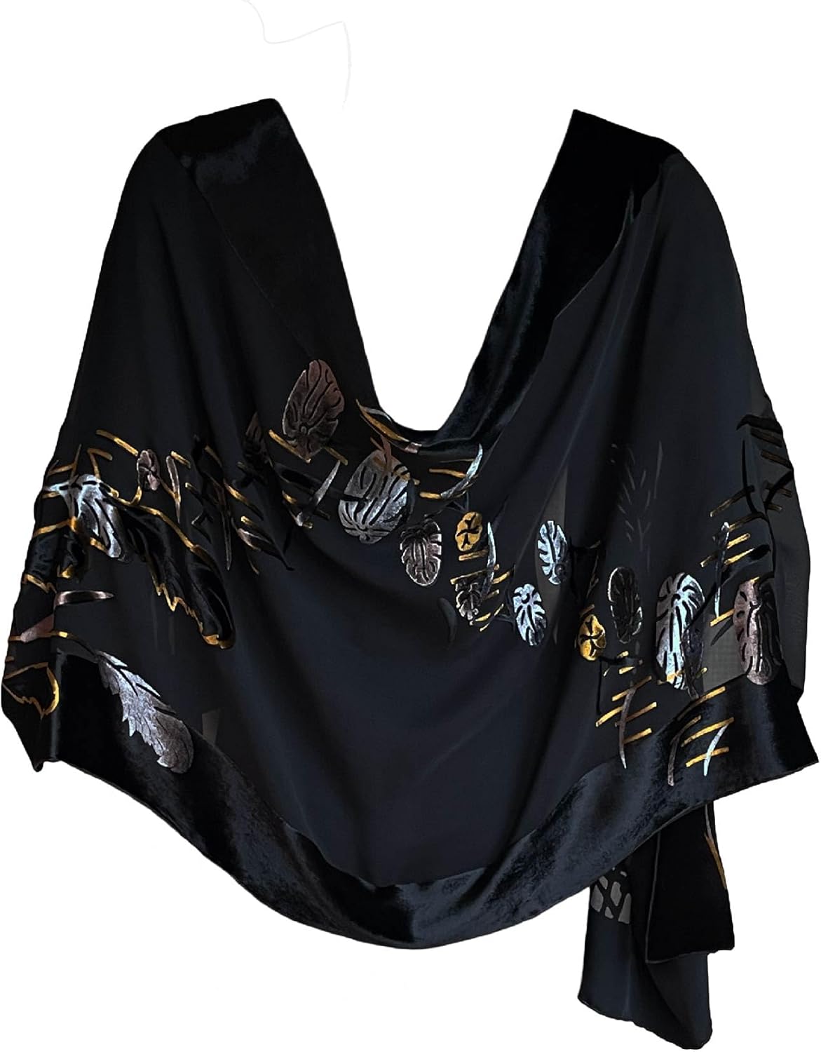 Silk Base Burn-out Velvet Shawl, 72" L x 21" W, Reed Catkin, Black Gold