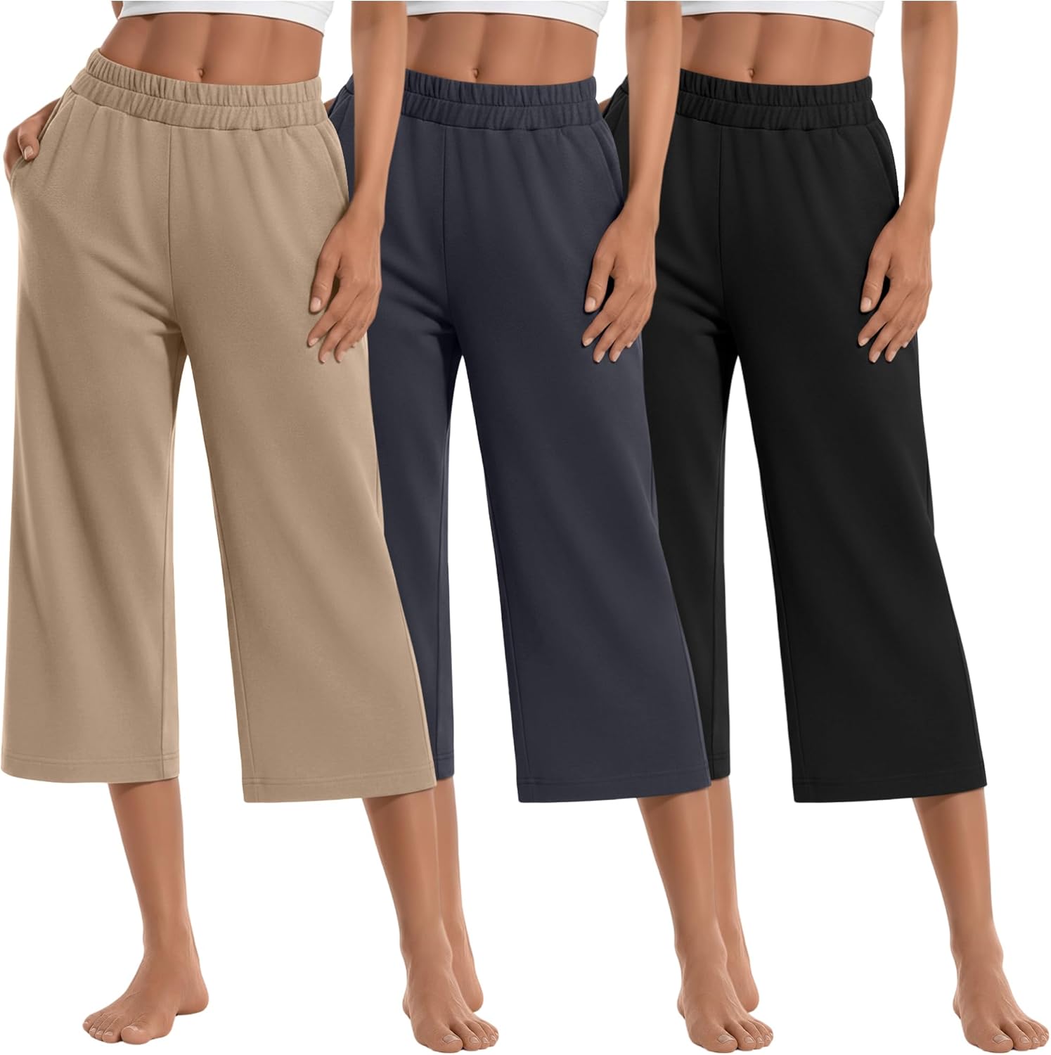 3 Pack Women's Wide Leg Capris Loose Cropped Yoga Pants Elastic Soft Sweatpants Capri Trousers with Pockets