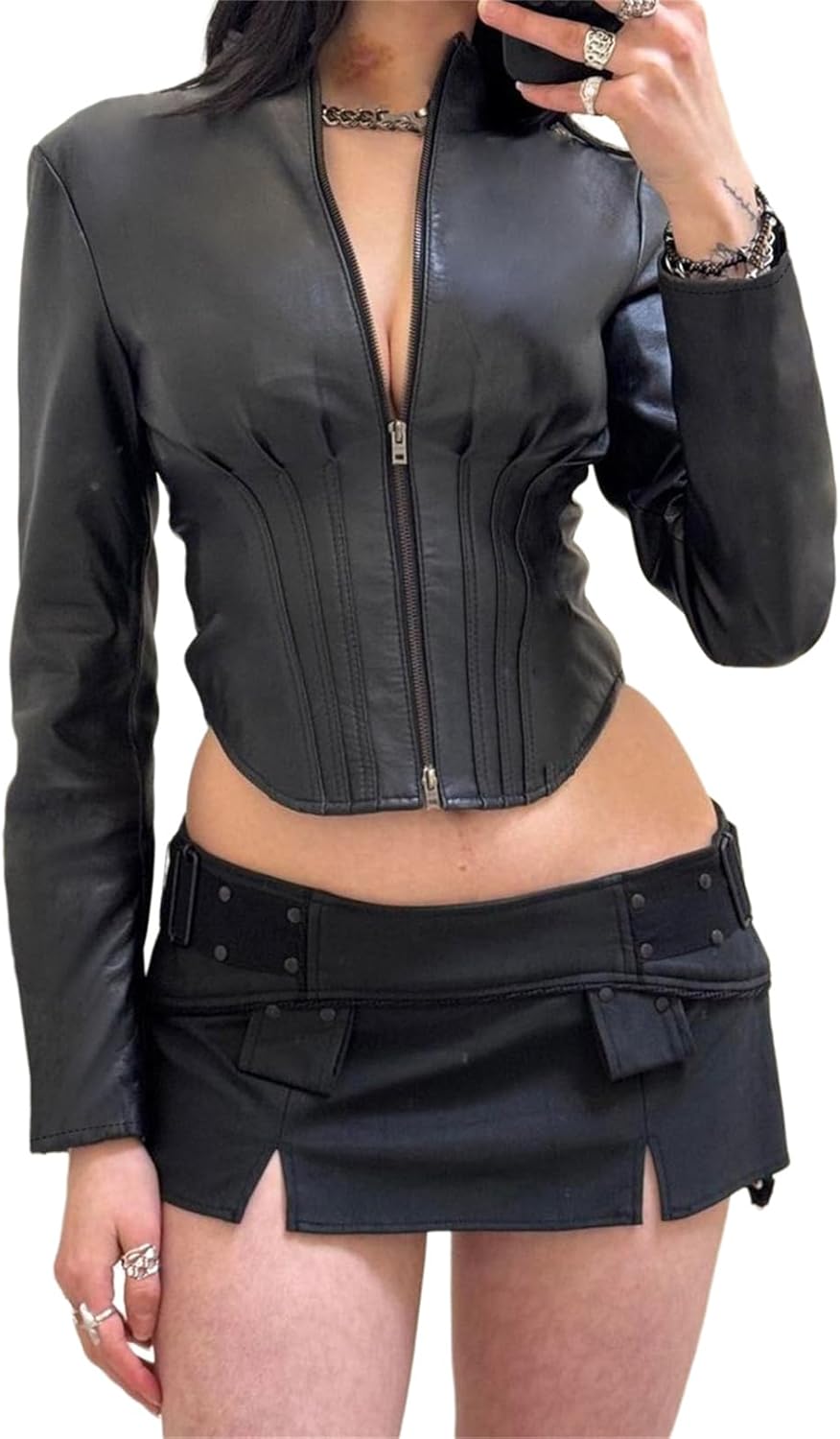 TOMETO STAR Women Punk Techwear Crop Jacket - Faux Leather Long Sleeves Zipper Mock Neck Gothic Biker Streetwear