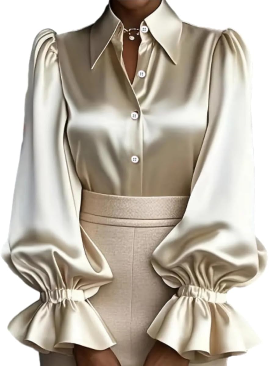 Women's Satin Collared Button Front Puff Sleeve Ruffled Flare Cuff Blouse – Elegant Office Work Business Casual Top