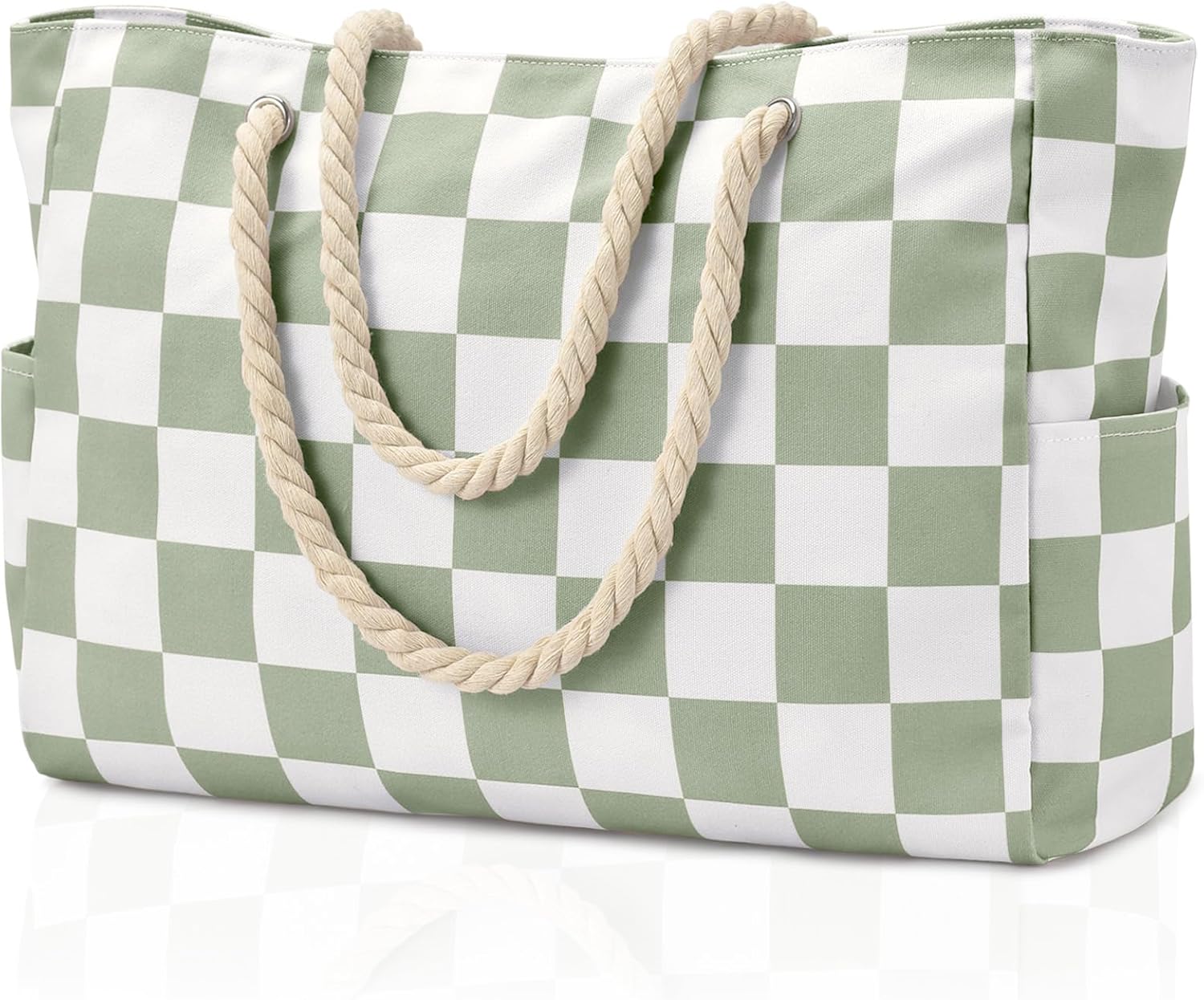 Becokan Beach Bags for Women Checkered Large Beach Tote Bag Zipper Beach Bags Waterproof Sandproof Canvas Swim Pool Bag