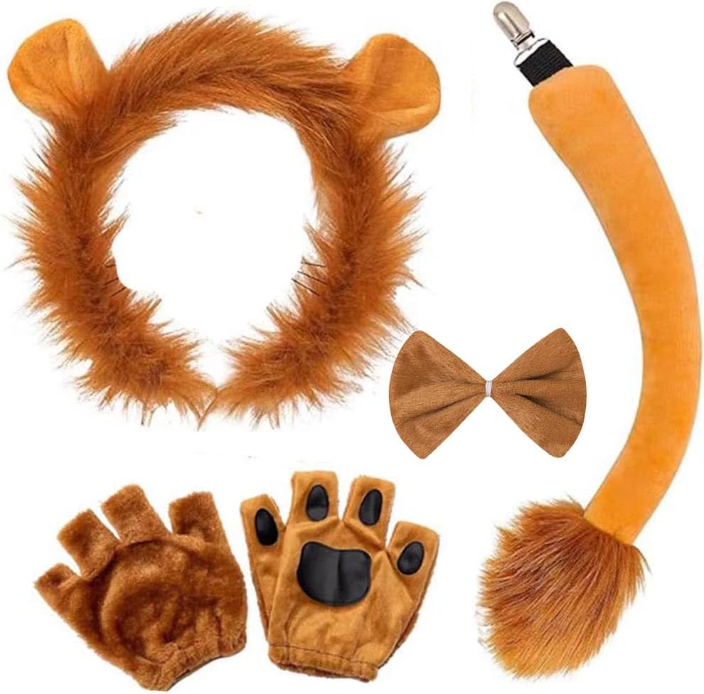 Lion Ears Headband with Tail, Paw Gloves, Bow Tie Lion Costume Set for Halloween Cosplay Family Dress-Up