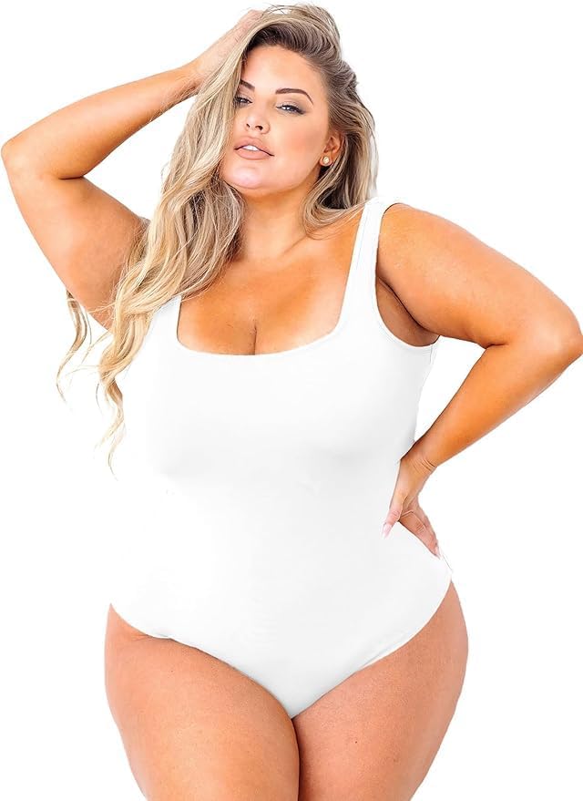 POSESHE Plus Size Bodysuits For Women Sleeveless Sexy Tank Top Square Neck Bodysuit Outfits, 5X, White
