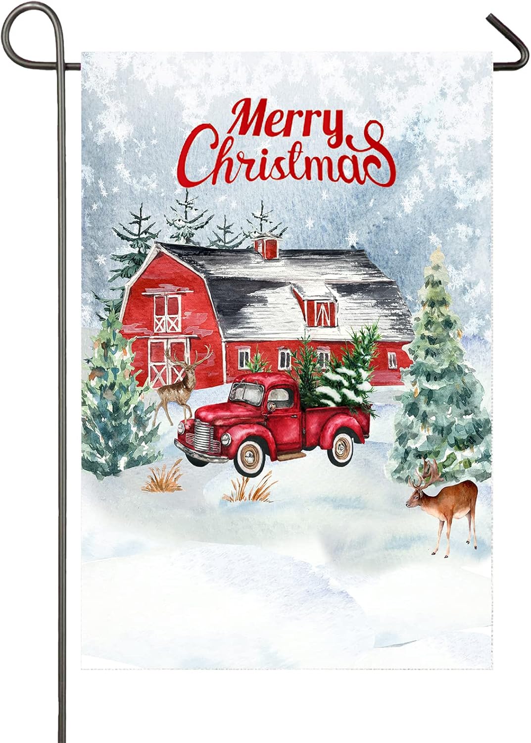 - MERRY CHRISTMAS GARDEN FLAG: Holiday garden flag is a good choice for traditional festivals and adds a strong festive atmosphere. This winter garden flag features farm barn, red pickup truck, christmas tree, deer and "Merry Christmas" reads correctly on both sides. Perfect for adding color and beauty to your outdoor garden, yard, patio, front porch, farmhouse winter decor.