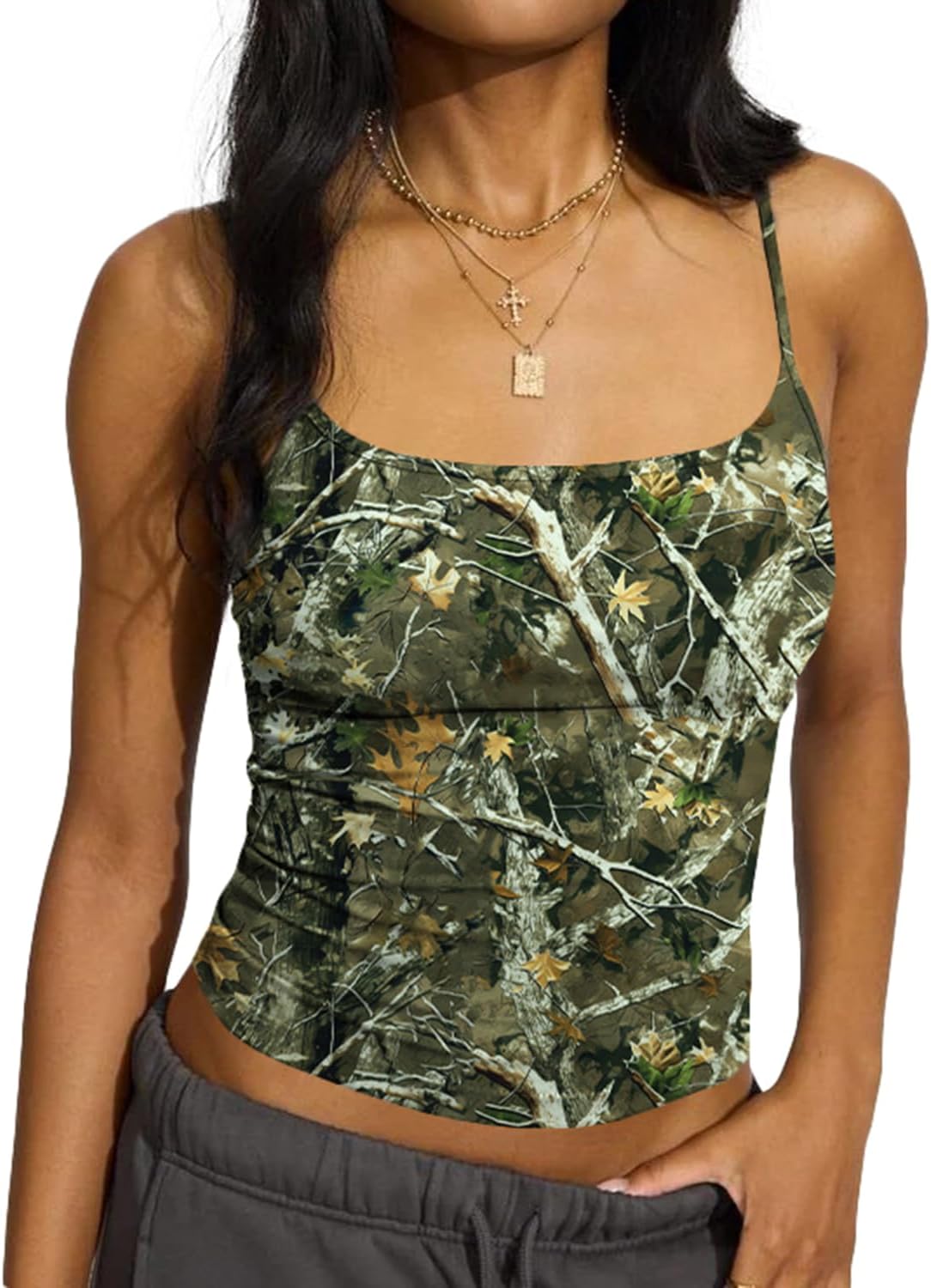 BAIGRAM Women Camo Crop Tank Top Spaghetti Strap Backless Camisole Fitted Maple Leaf Print Sleeveless Going Out Top Y2K