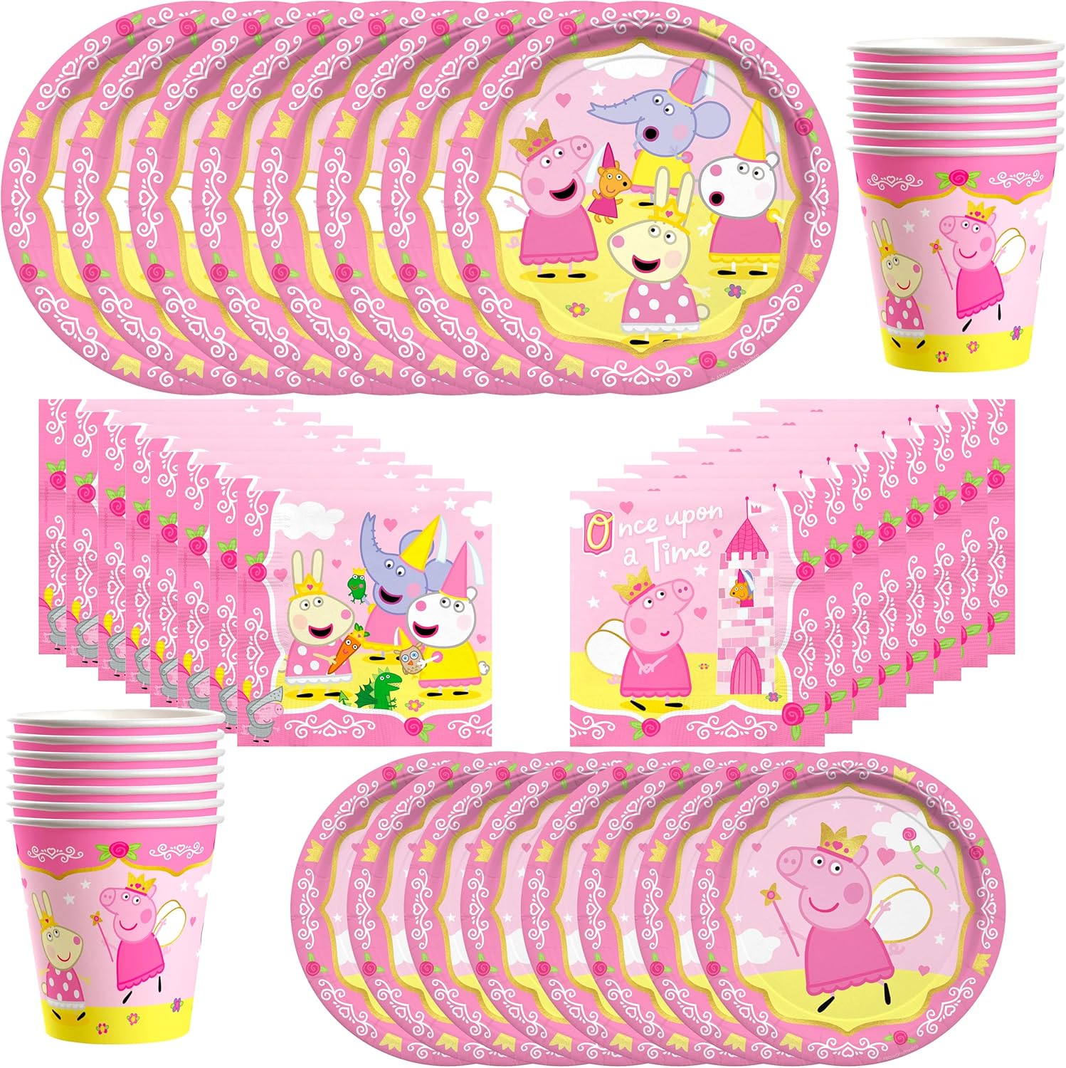 - Our set of Peppa Pig birthday decorations includes (24) 7in Peppa Pig cake plates, (24) 9in Peppa plates, (24) 9oz Peppa Pig cup & (32) Peppa Pig party napkins. Party in style with our Peppa Pig party pack.