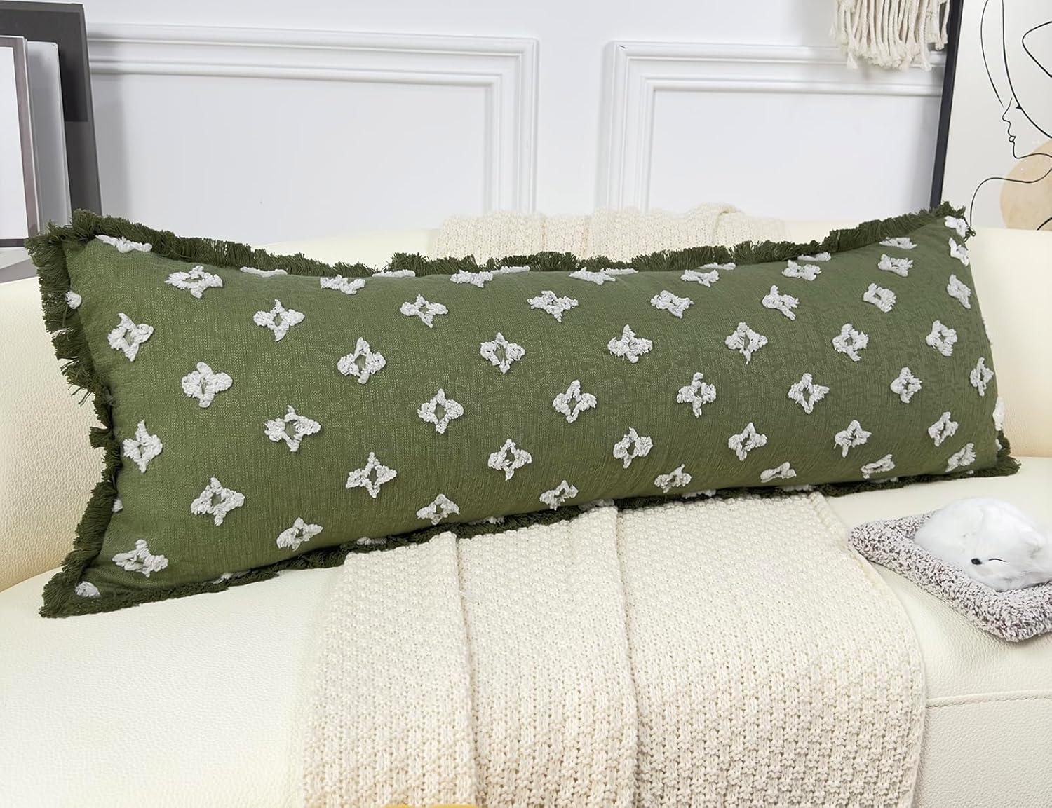 Boho Long Lumbar Pillow Cover 12x48 with Tassel Fringe,3D Flower Patterned Extra Decorative Long Lumbar Pillow Cover Case for Sofa Couch Bed Livingroom Farmhouse,Sage Green