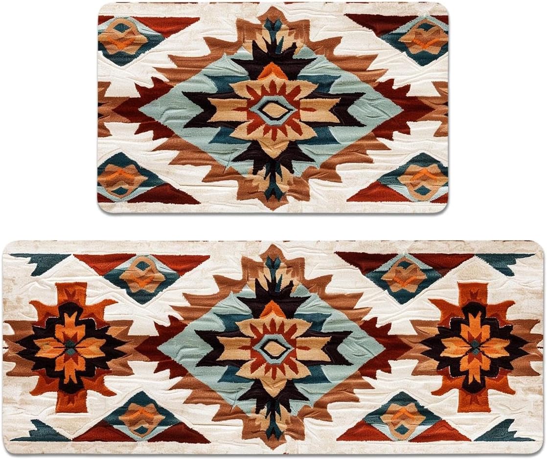 Rustic Navajo Kitchen Rugs Set of 2, Aztec Geometric Cotton Blend Linen Non Slip Kitchen Floor Mats for Home Office Bedroom Bathroom Laundry, Southwestern Gift, 17" x 29 + 17" x 47"