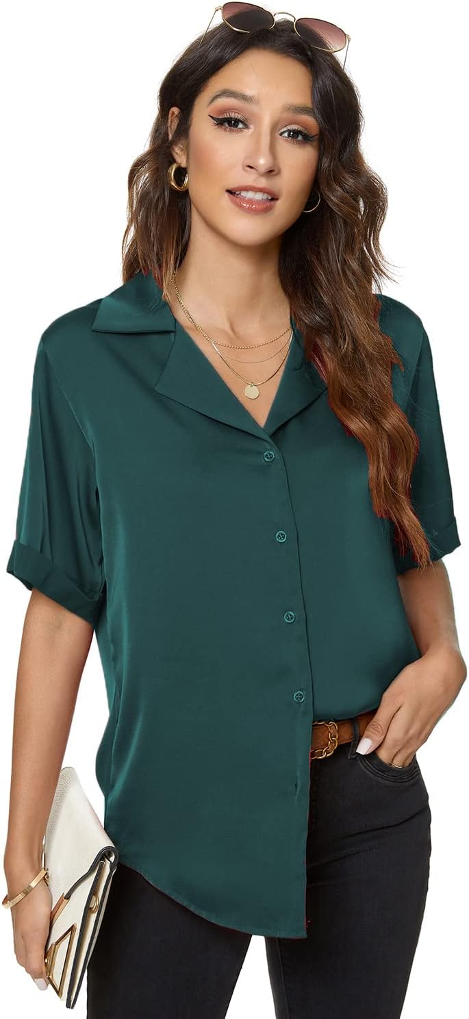 Atnlewhi Women's Short Sleeve Button Down Satin Silk Shirts Casual Business Work Office Blouse Top